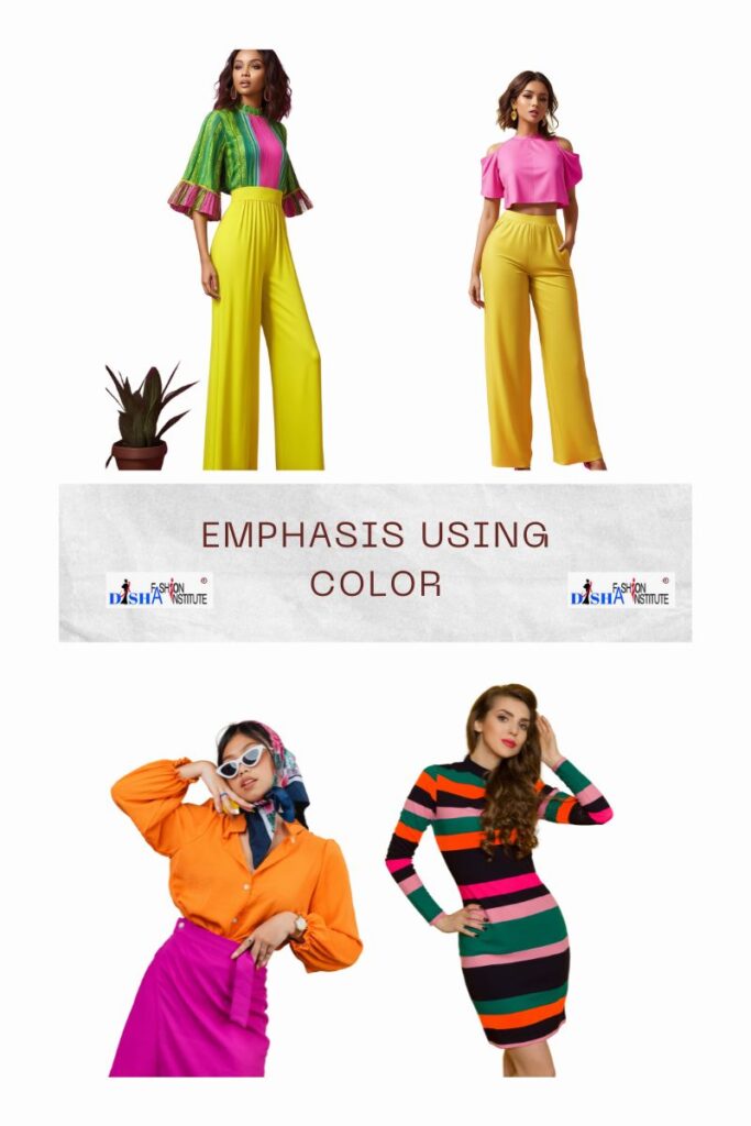 Emphasis in fashion design can be achieved through the use of all the elements of design like line, color, texture, pattern, shape, space, form, placement, or any combination of these elements.