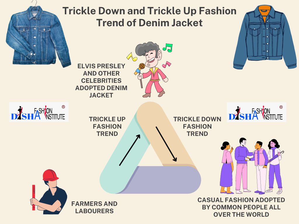 Though the denim jacket was originally designed as a workwear garment for farmers and labourers I think we can use this as an example of both Trickle Down and Trickle Up Trend. In 1953, Marlon Brando wore a denim jacket in the film “The Wild One,” and it quickly became a symbol of teenage rebellion. The jacket was soon adopted by other celebrities, such as James Dean and Elvis Presley, and it became a popular item among young people all over the world.