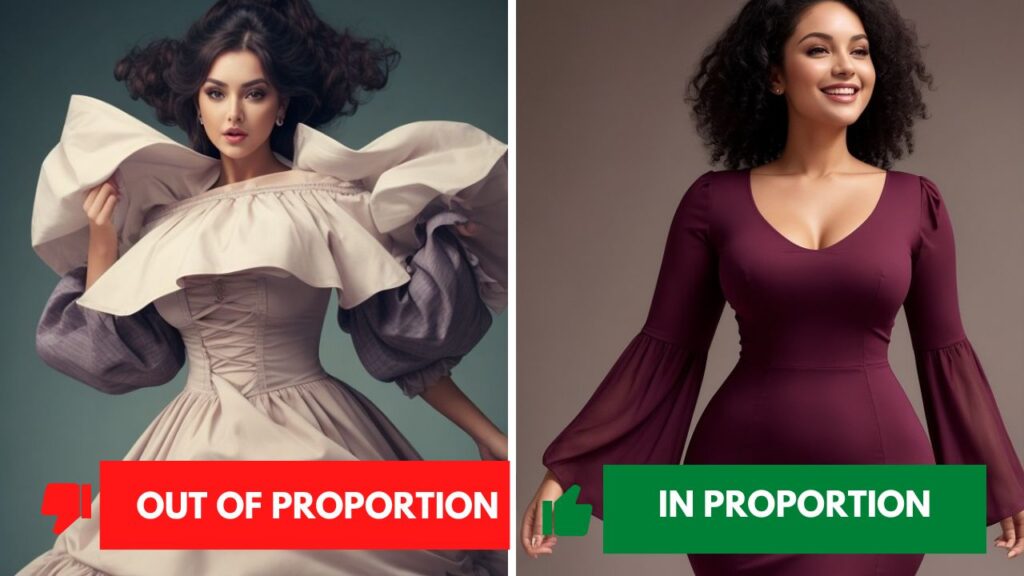 For instance, imagine a dress with an overly large sleeve that dominates the rest of the dress. In this case, the dress is considered “out of proportion” or disproportionate because the sleeve overwhelms the balance of the entire design. Conversely, if a part of an outfit, like a collar or a pocket, is too small compared to the rest of the garment, it may also be considered disproportionate.
