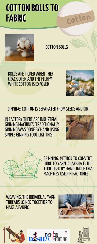 Ginning: The cotton bolls consist of cotton and seeds. The process of separating the cotton from the seeds is called ginning. It also helps in removing impurities like dust, small stones, wooden particles etc.